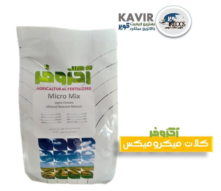 کود میکرومیکس دارای 3.3% روی ، 5.7% آهن ، 3.2% منگنز ،1.2% مس ، 0.85% بر ، 30%ماده آلی ، 5درصد اسید آمینه و 25درصد اسیدهای پلی هیدروکسی کربوکسیلیک می باشد.