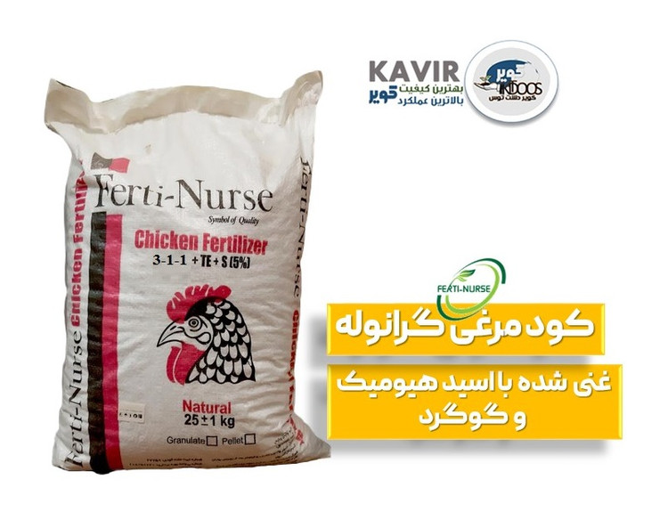 کود مرغی گرانوله فرتی نرس که از انواع کودهای ارگانیک محسوب می شود محتوی 3% نیتروژن، 1% فسفات به صورت P2O5، 1% پتاسیم به صورت K2O، حداکثر 40% مواد آلی، و عناصر ریز مغذی شامل روی، منیزیوم، مس و آهن است. این محصول علاوه بر افزایش عملکرد گیاهان باعث افزایش مقاومت گیاه به تنش های شوری، خشکی و گرما می شود.